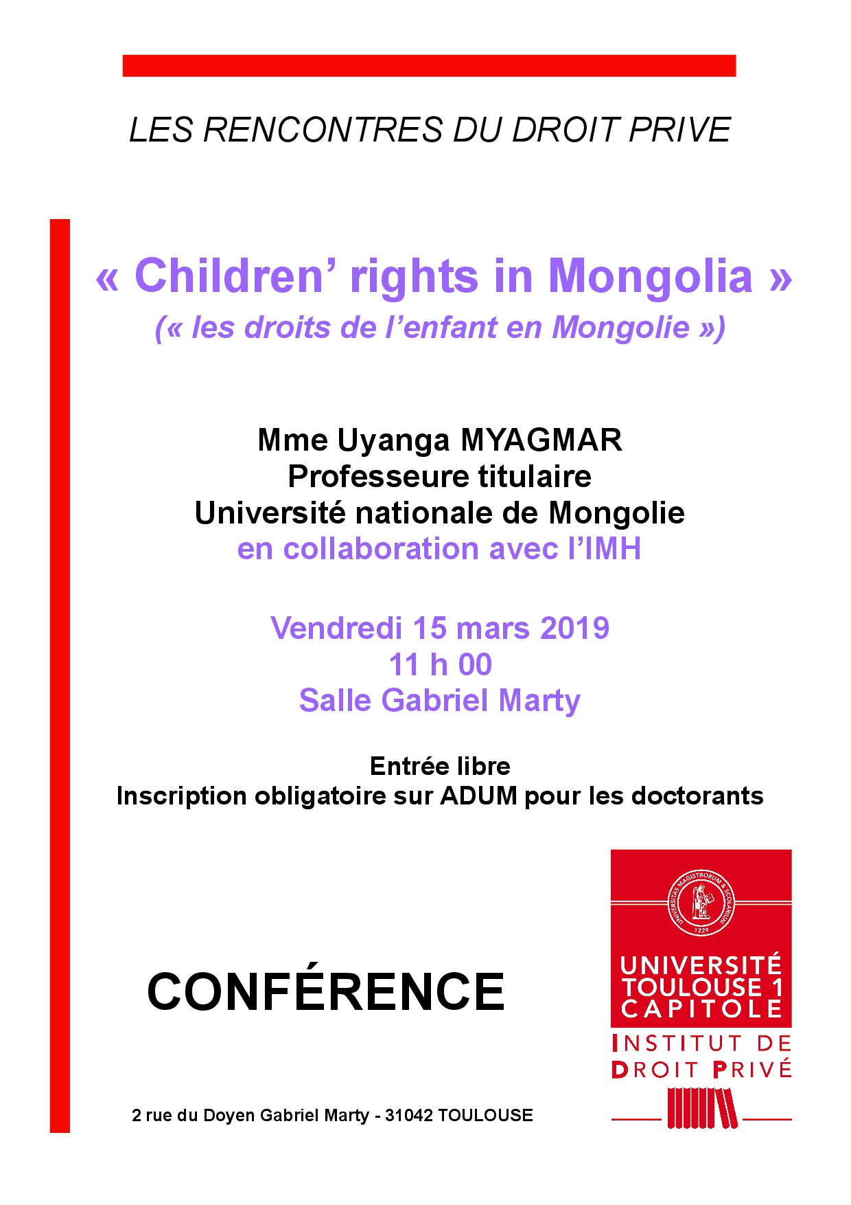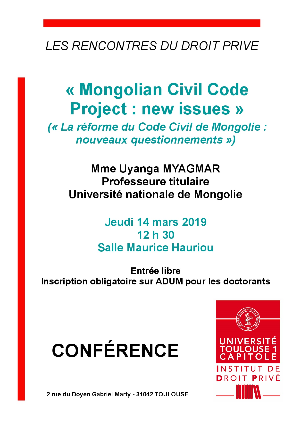 - « La Réforme du Code Civil de Mongolie : nouveaux questionnements », le jeudi 14 mars 2019, 12h30, salle Maurice Hauriou