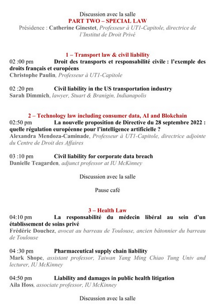 "Droit comparé de la responsabilité civile affairiste" Colloque de l'IDP et de l'Université McKinney
