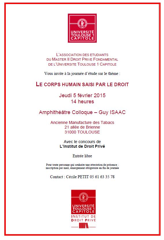 "Le corps humain saisi par le droit" journée d'étude du Master II Droit Privé Fondamental avec le concours de l'IDP