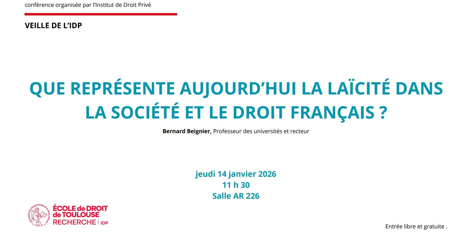 La prochaine veille de l'IDP se déroulera le mercredi 14 janvier 2026 dès 11 h 30 en salle AR 226 en présence de Monsieur le recteur Beignier et portera sur "Que représente aujourd'hui la laïcité das la société et le droit français ?".