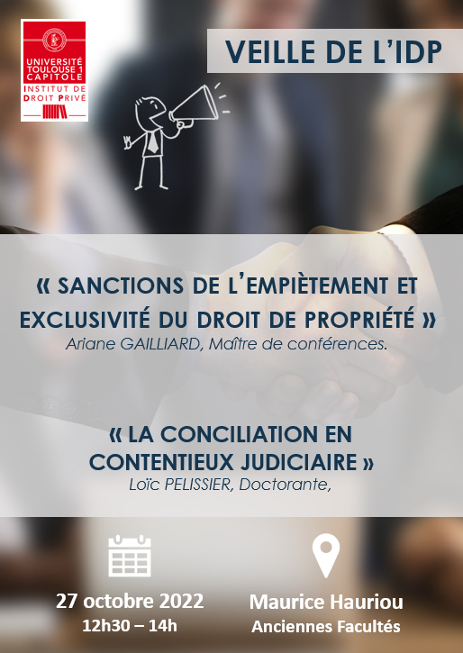 L'Institut de Droit Privé organise une veille juridique, le jeudi 27 octobre 2022 à 12h30, en salle Maurice Hauriou.