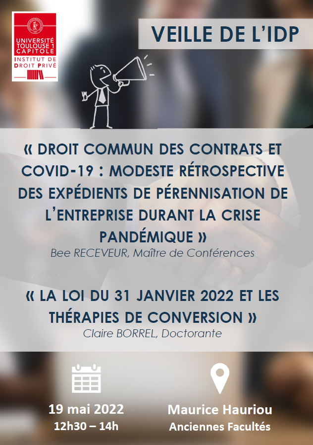 L'Institut de Droit Privé organise une veille juridique, le jeudi 19 mai 2022 à 12h30, en salle Maurice Hauriou.